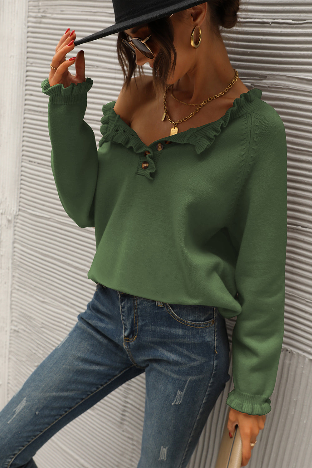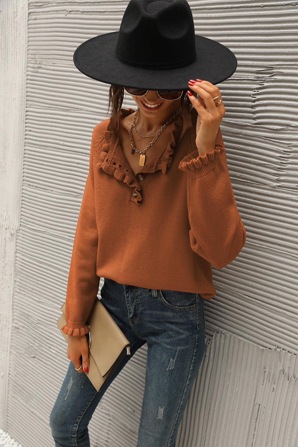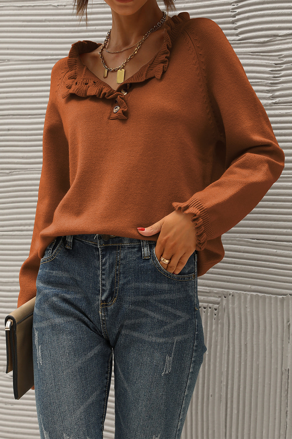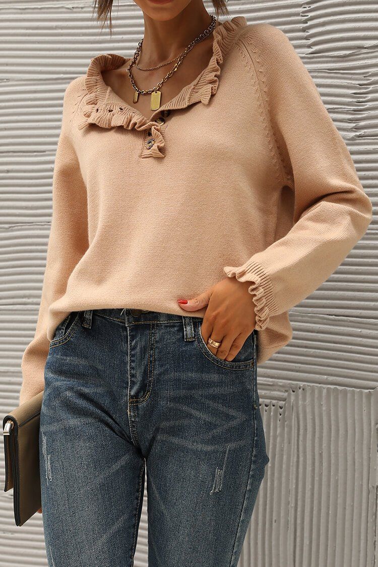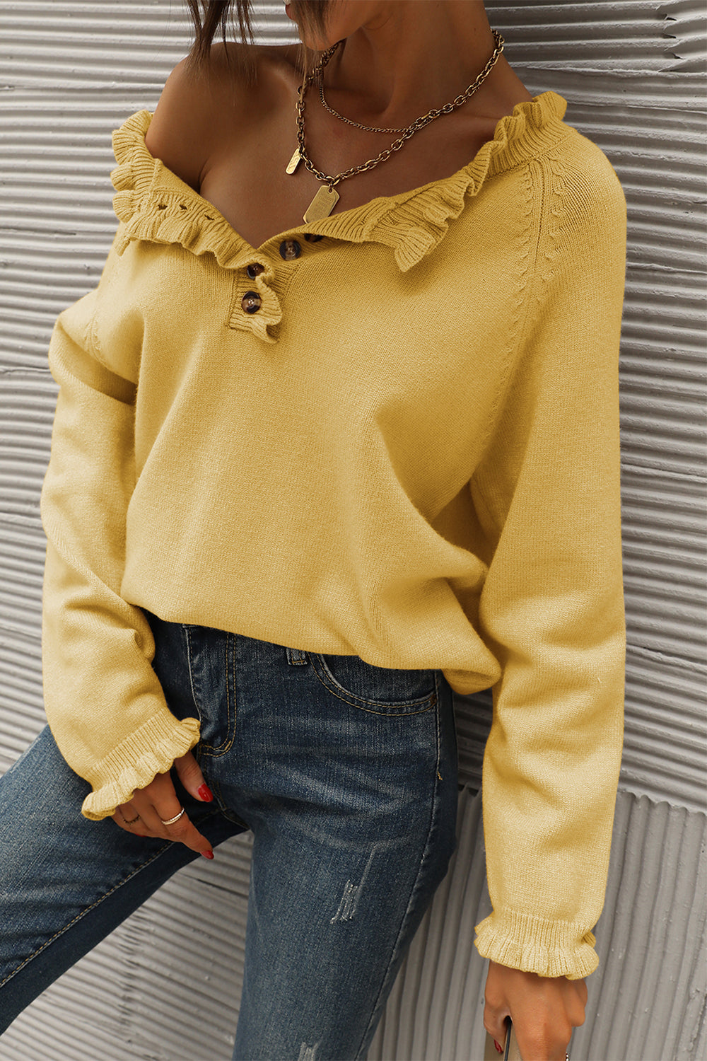 Long Sleeve Button Down Ruffle Knit Pullover Sweater Tops