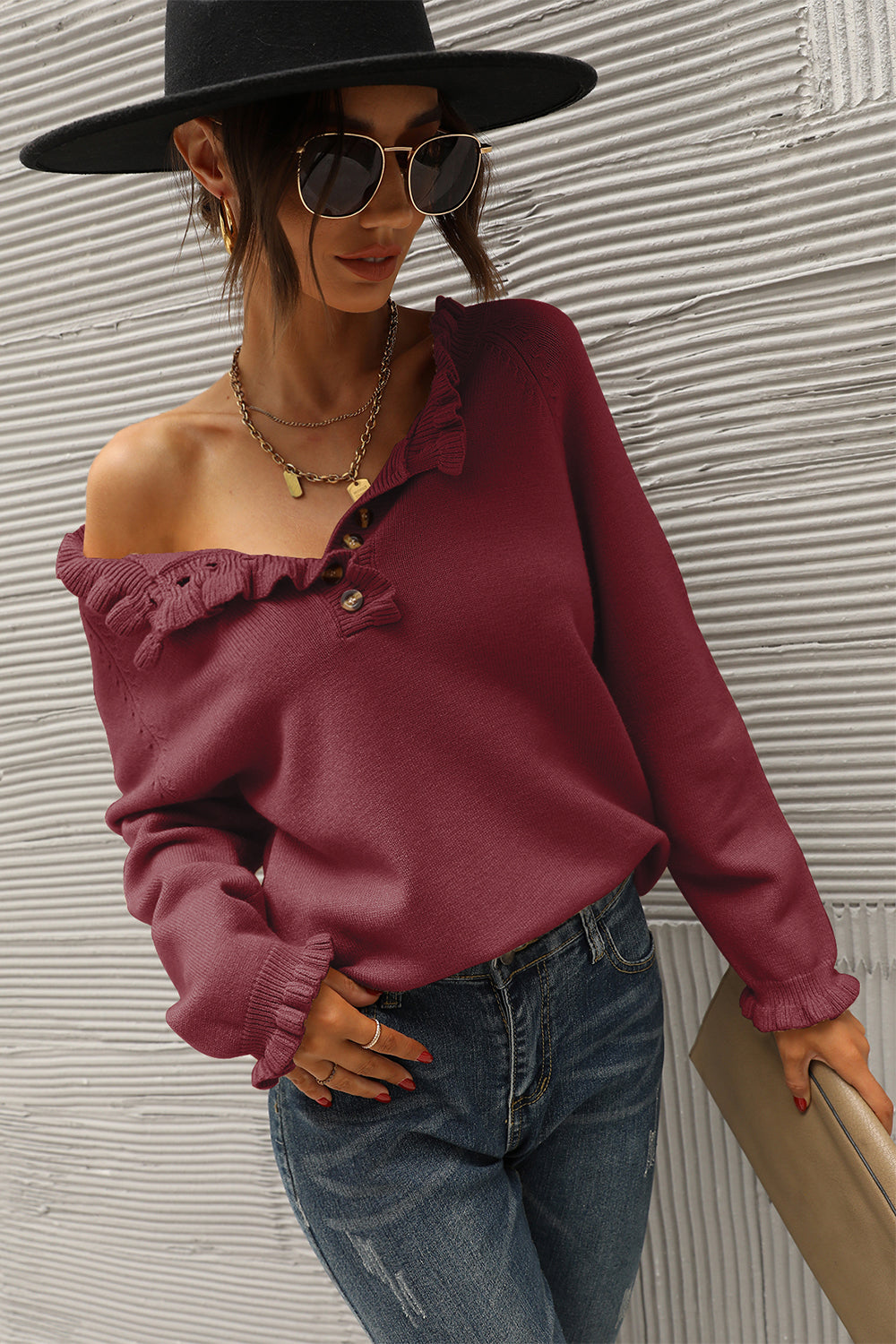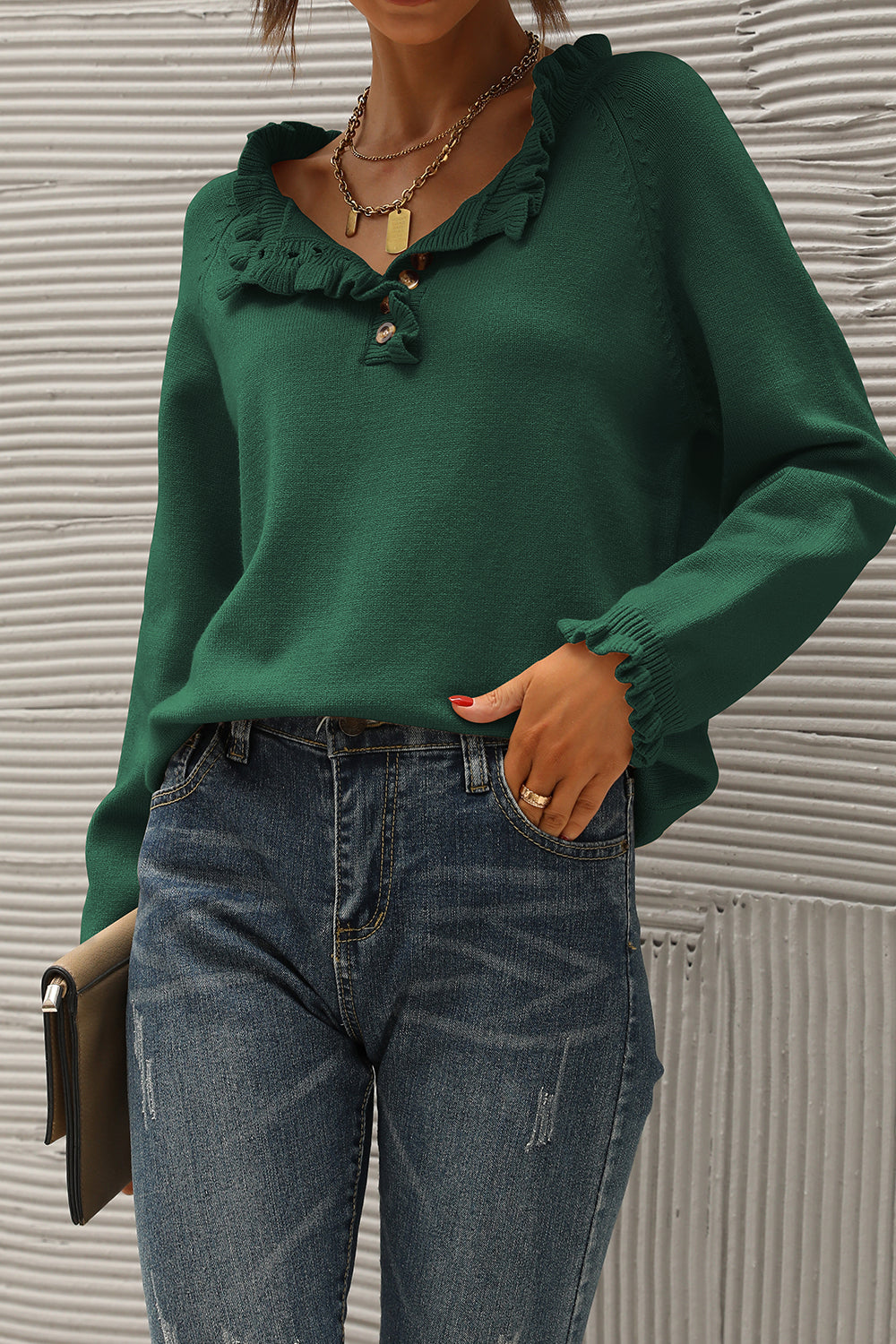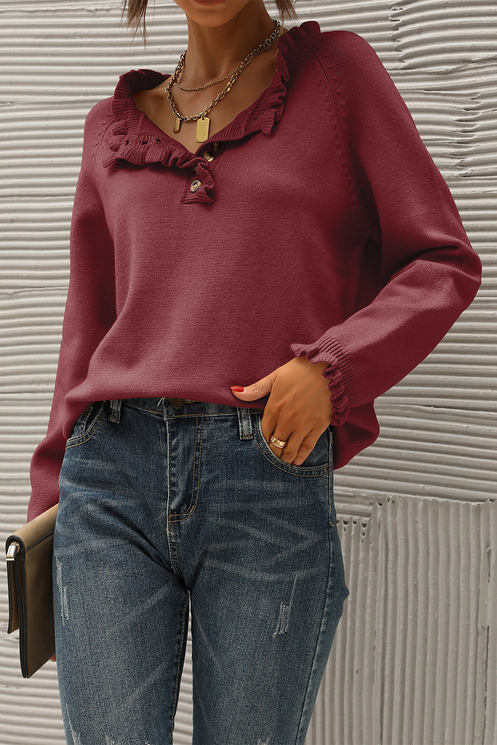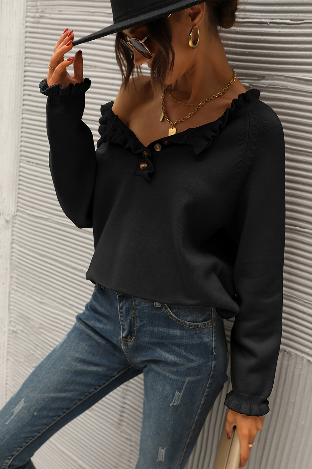 Long Sleeve Button Down Ruffle Knit Pullover Sweater Tops