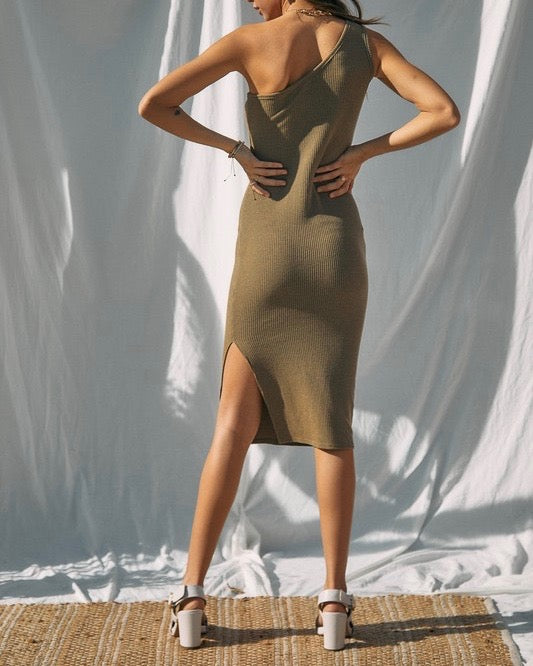 This dress is a basic but a need! Featuring a one shoulder design, slit detail, midi length, and ribbed fabric, this dress is perfect to be dressed up or down! Pair with some heels and a statement necklace for a chic look!